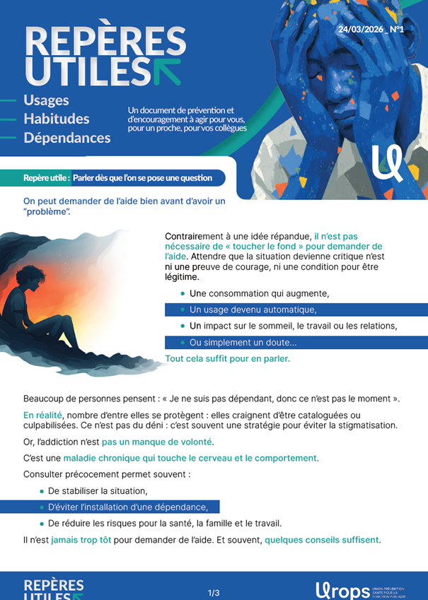 Ce nouveau document intitulé « Repères utiles » s’inscrit dans une démarche de prévention et de sensibilisation autour des usages, des habitudes et des dépendances. Il vise à déconstruire certaines idées reçues, notamment celle selon laquelle il faudrait atteindre une situation critique pour demander de l’aide. À travers des repères simples et accessibles, il encourage chacun à s’interroger sur ses pratiques, à oser en parler sans crainte de jugement et à agir le plus tôt possible. Destiné à tous – que ce soit pour soi-même, pour un proche ou pour un collègue – ce document met en avant l’importance du dialogue, de l’accompagnement et d’une approche globale de la santé. Il rappelle enfin que l’addiction est une maladie et que des solutions existent, souvent simples et adaptées, dès les premiers signes ou questionnements.